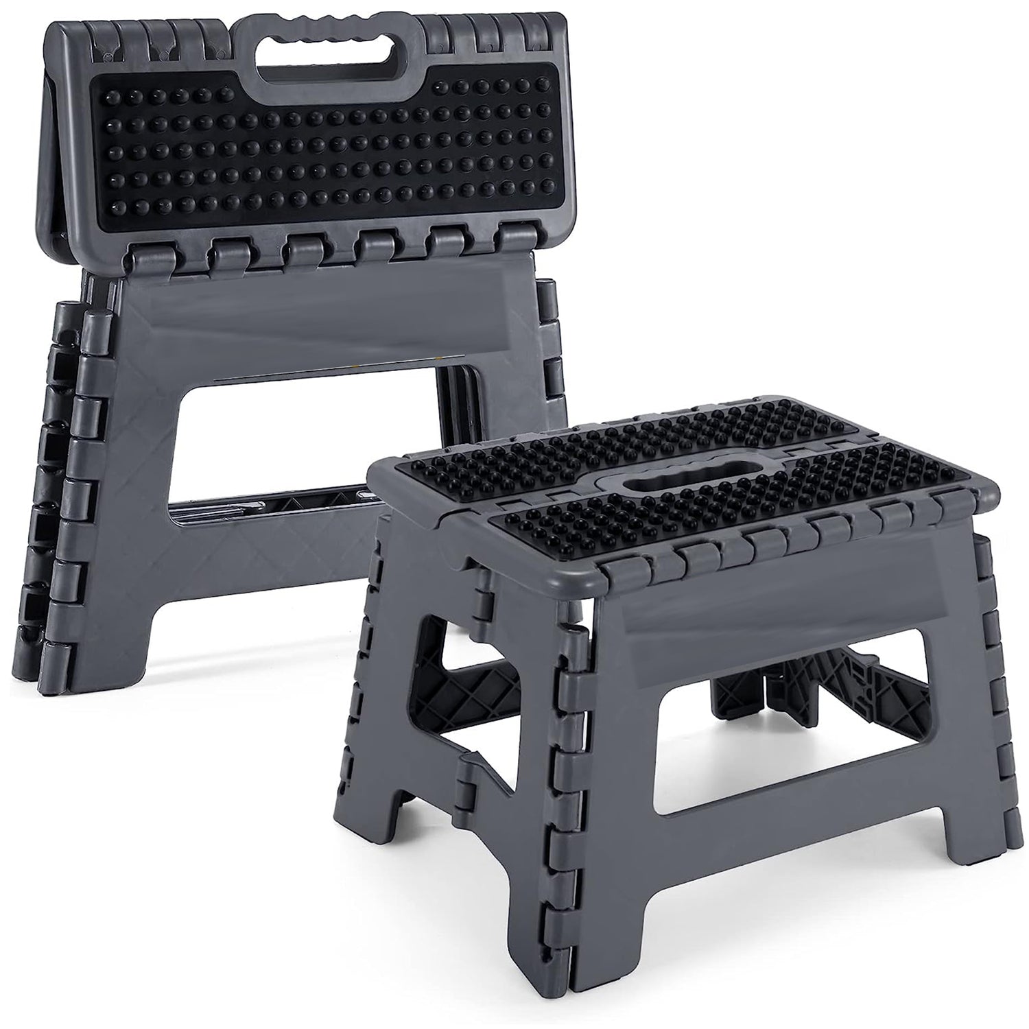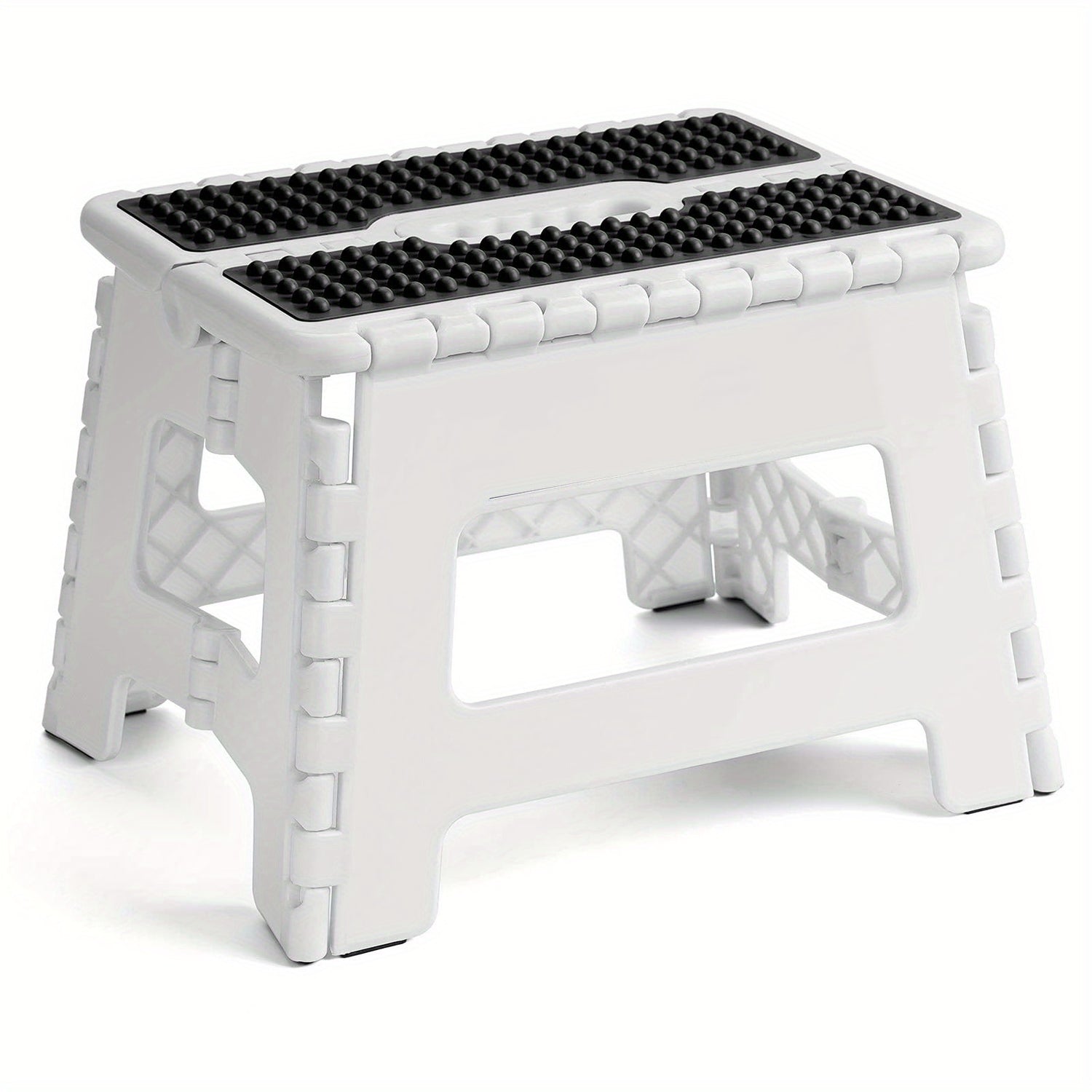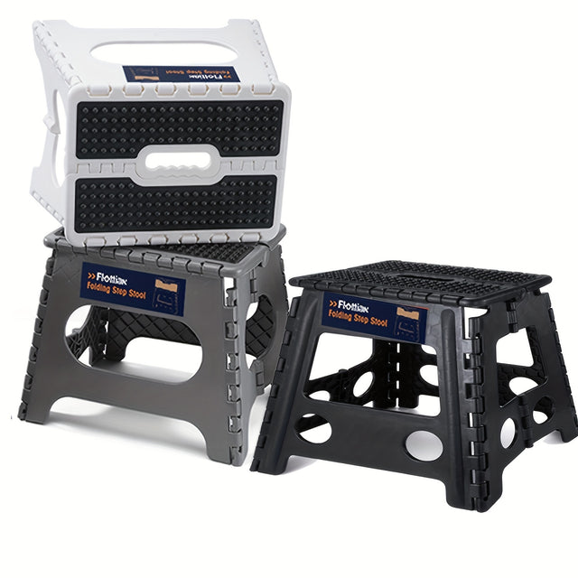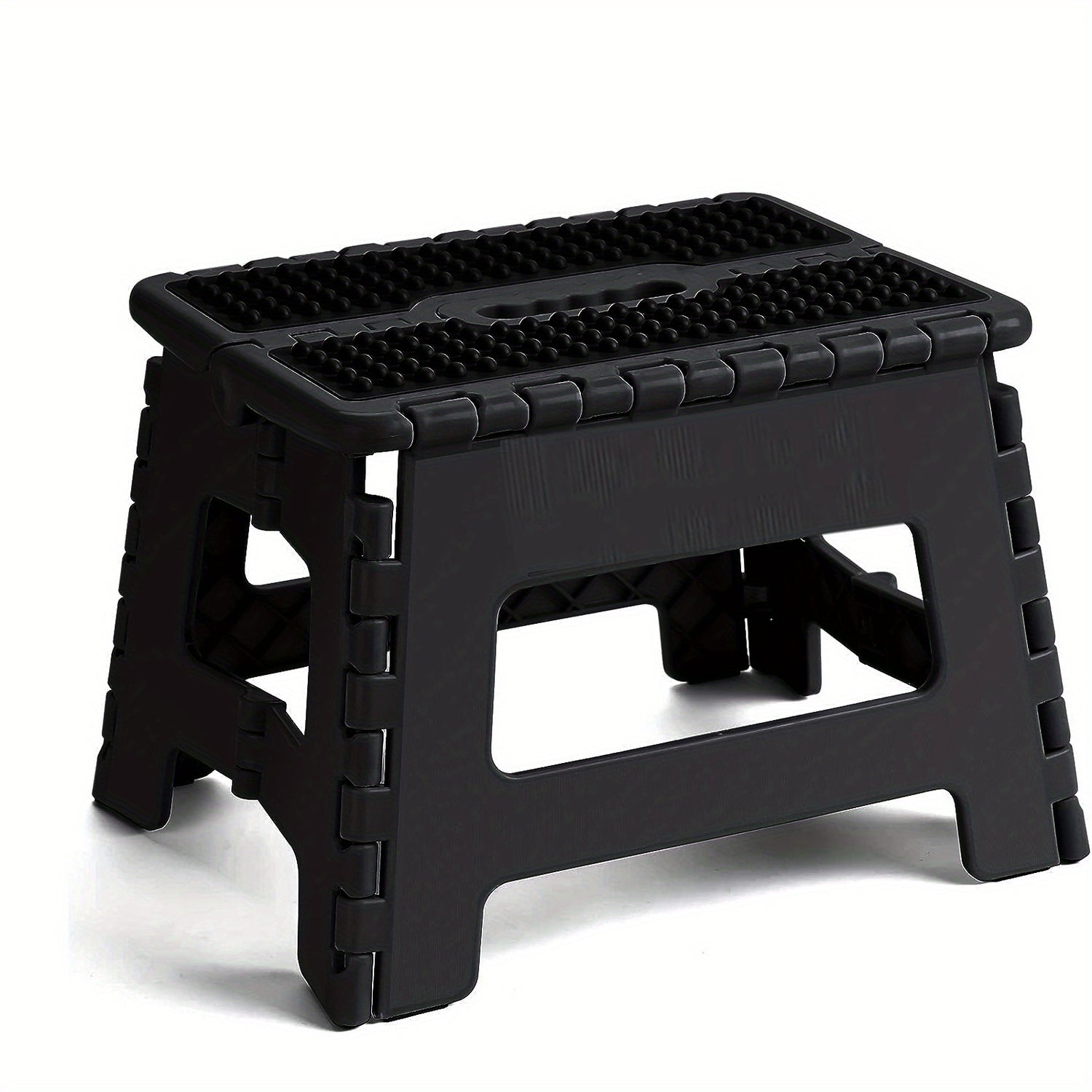 Curated 22.86cm tall folding step stool for handpicked convenience. Non-slip, foldable design with a handle, made of heavy-duty plastic for kitchen and bathroom use. Holds up to 136.08KG, available in black.