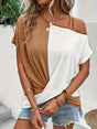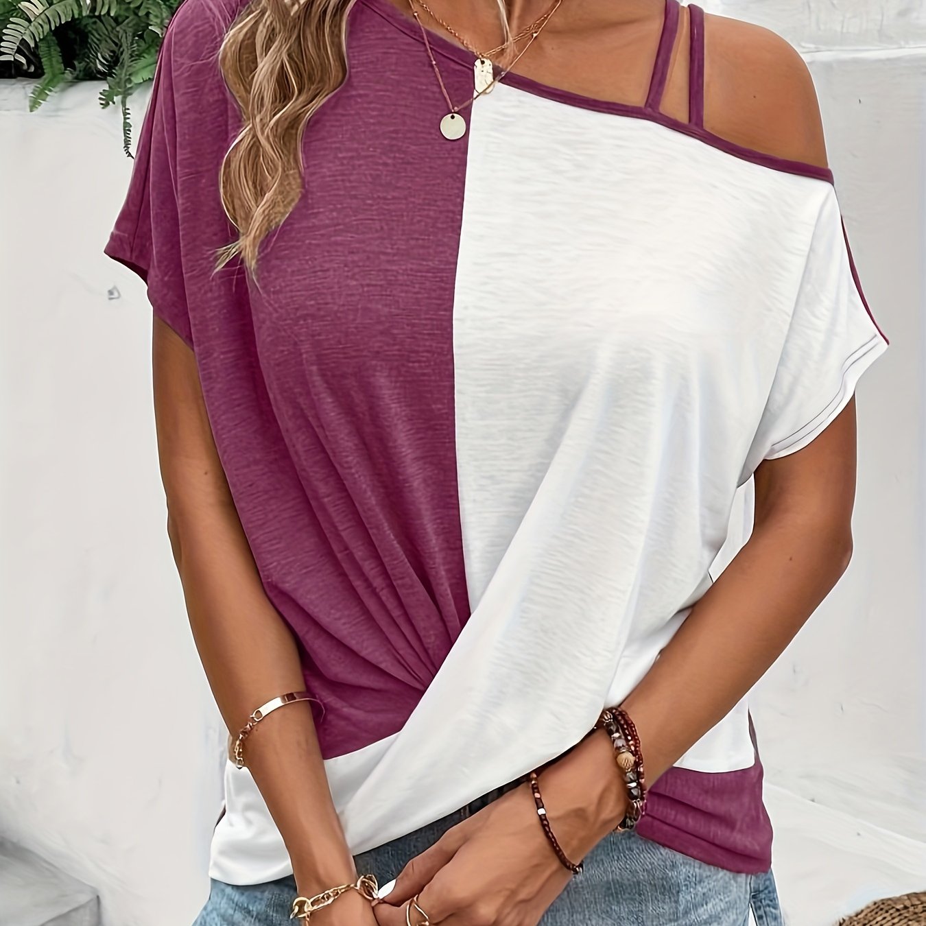 Color Block One Shoulder T-shirt, Elegant Short Sleeve Top For Spring & Summer, Women's Clothing