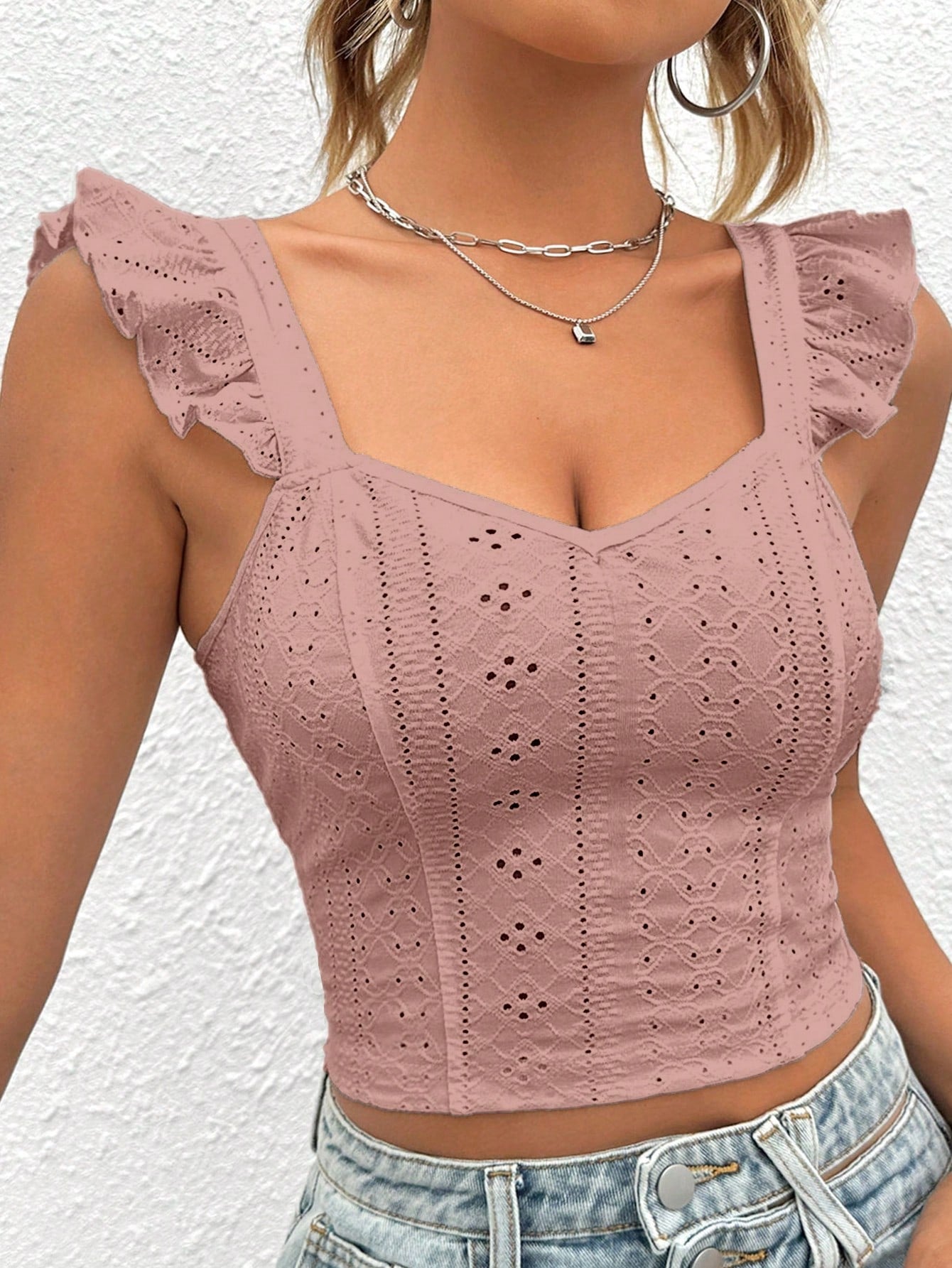 Embrace the allure of our Eyelet Embroidery Ruffle Trim Crop Top in elegant Mint Green.