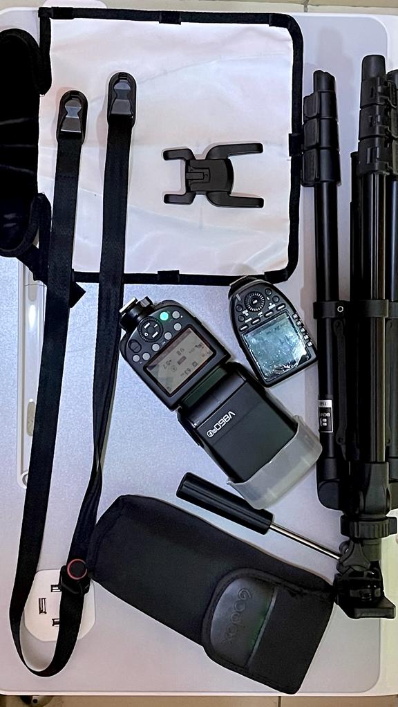 - Accessories: Battery Grip, Godox V860III Flash, Godox X-Pro Trigger, Strap, Flash Diffuser, Tripod, Camera Bag, Green Backdrop with Stand and Clamps, Softbox JOHZA 200-D Video Light Kit with Stand