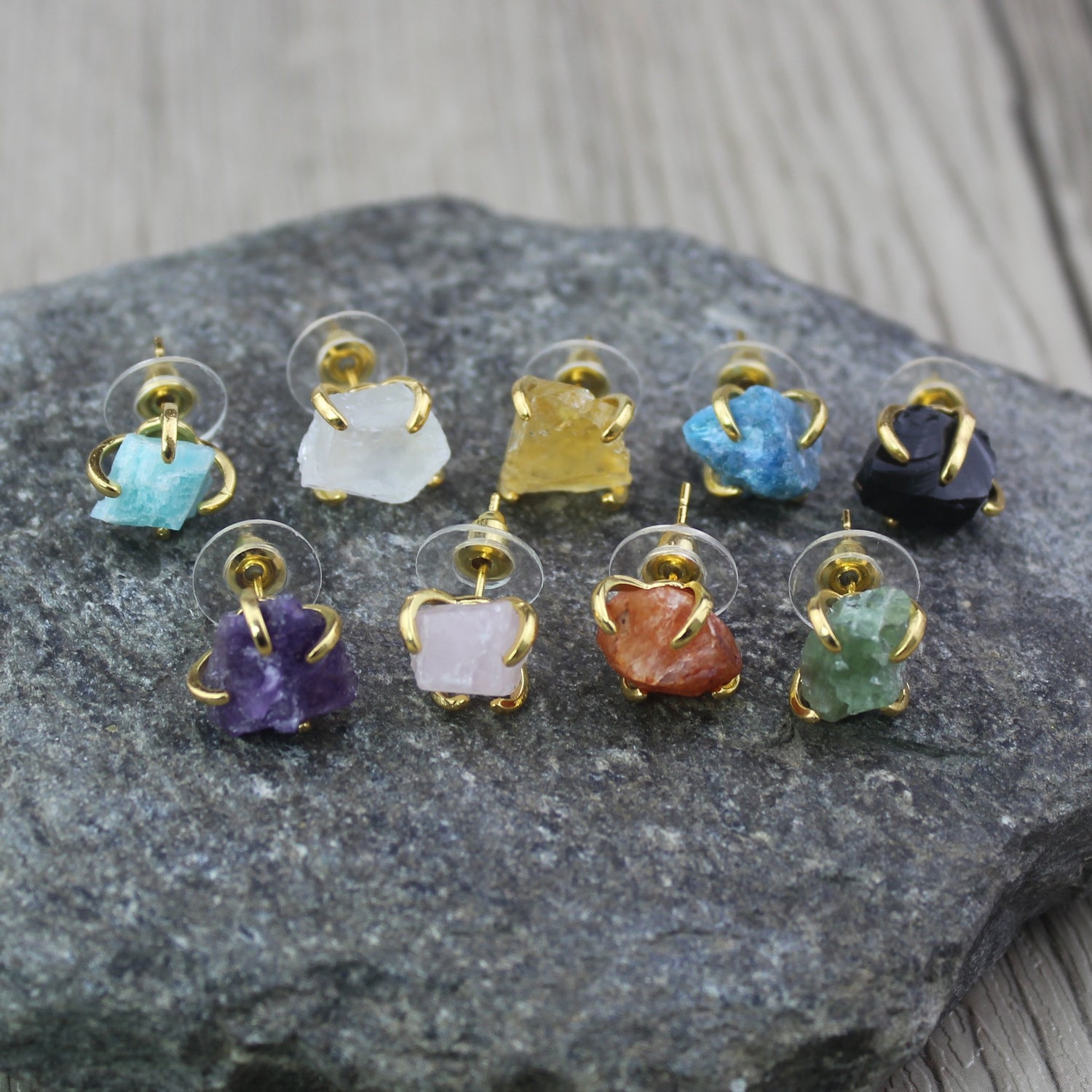 Handmade Small Stud Earrings Embellished With Color Natural Stone Bohemian Style Unique Statement Female Earrings - Amethyst is backordered and will ship as soon as it is back in stock.