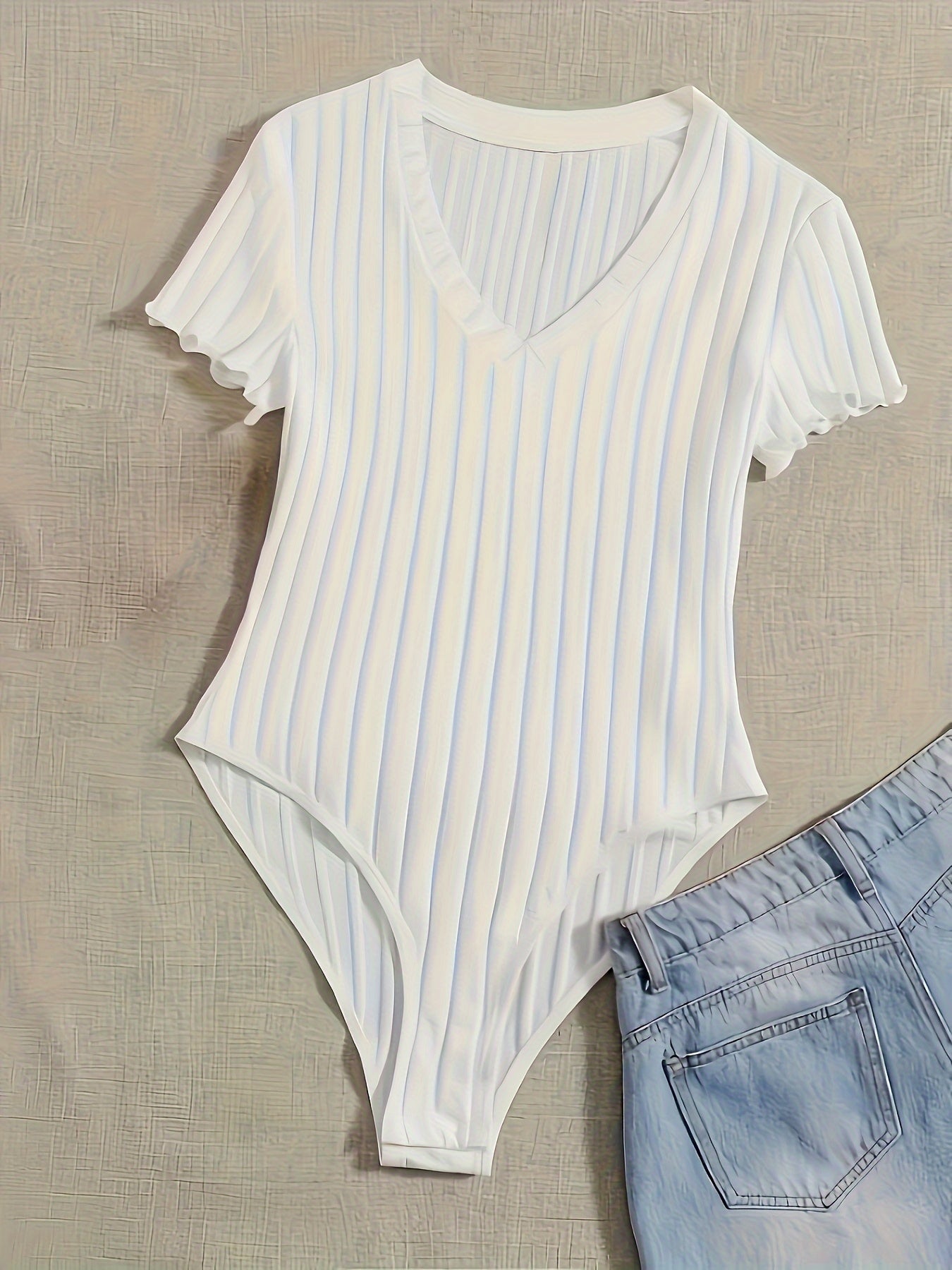Sexy ribbed bodysuit with lettuce trim, perfect for spring & summer.