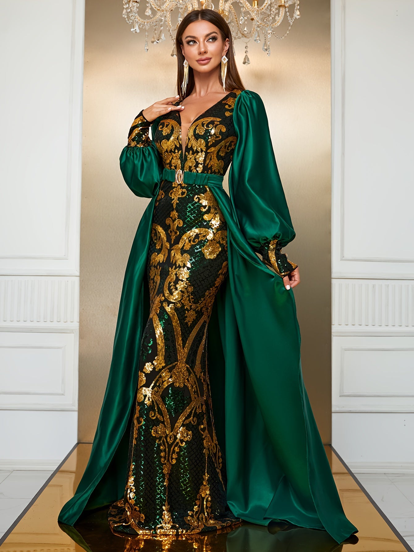 Curated handpicked mermaid dress with sequin decor, featuring elegant lantern sleeves and a plunging neckline, perfect for party & banquet.
