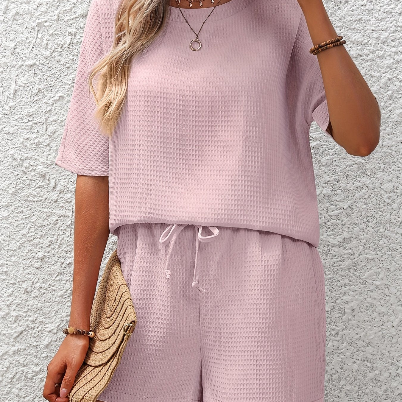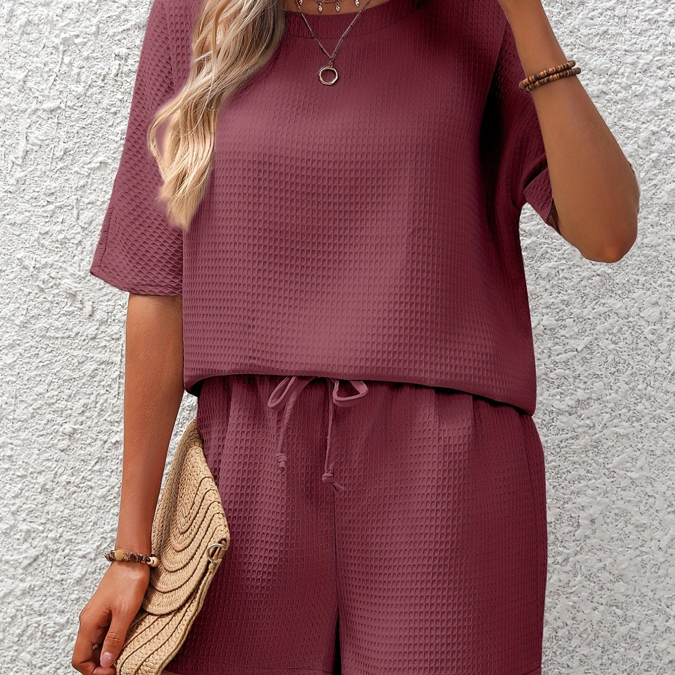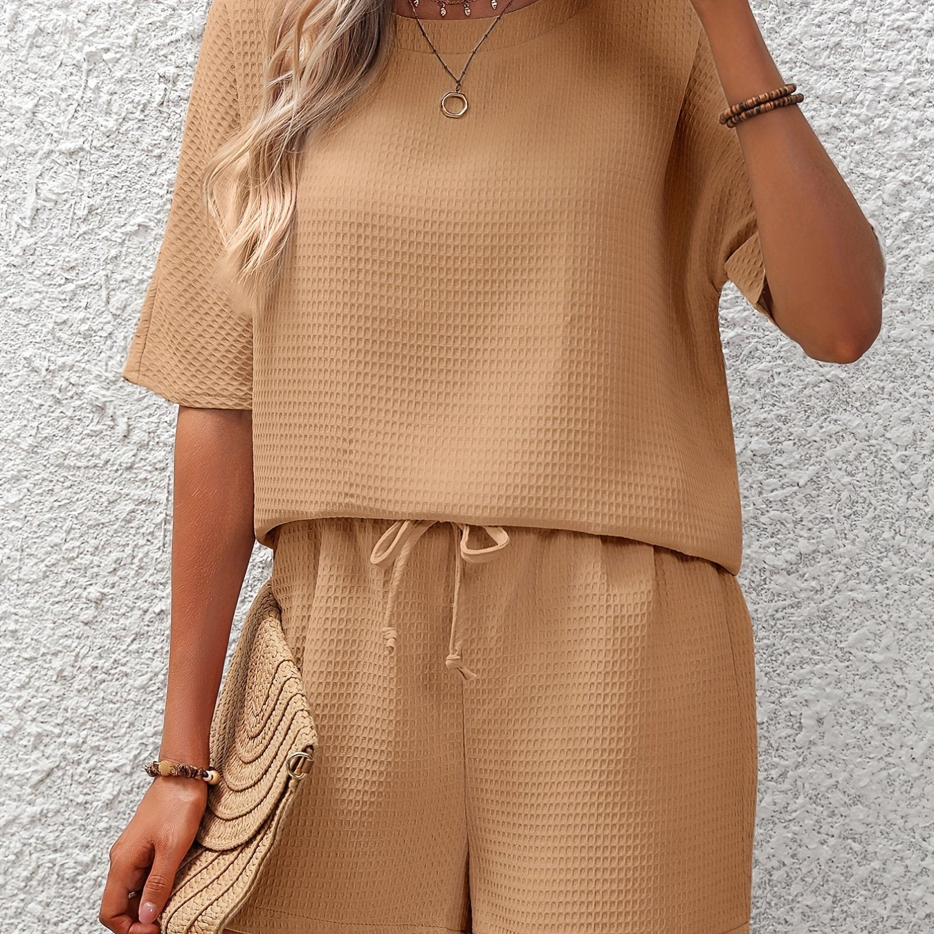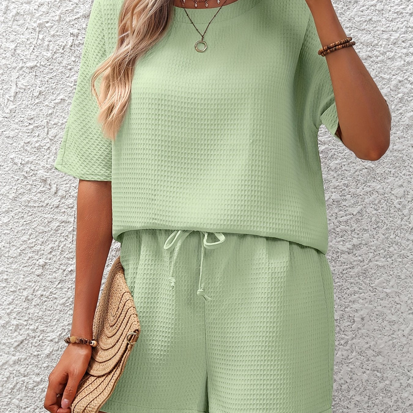 Solid Waffle Two-piece Set, Crew Neck Short Sleeve Tee & Drawstring Shorts Outfits, Women's Clothing