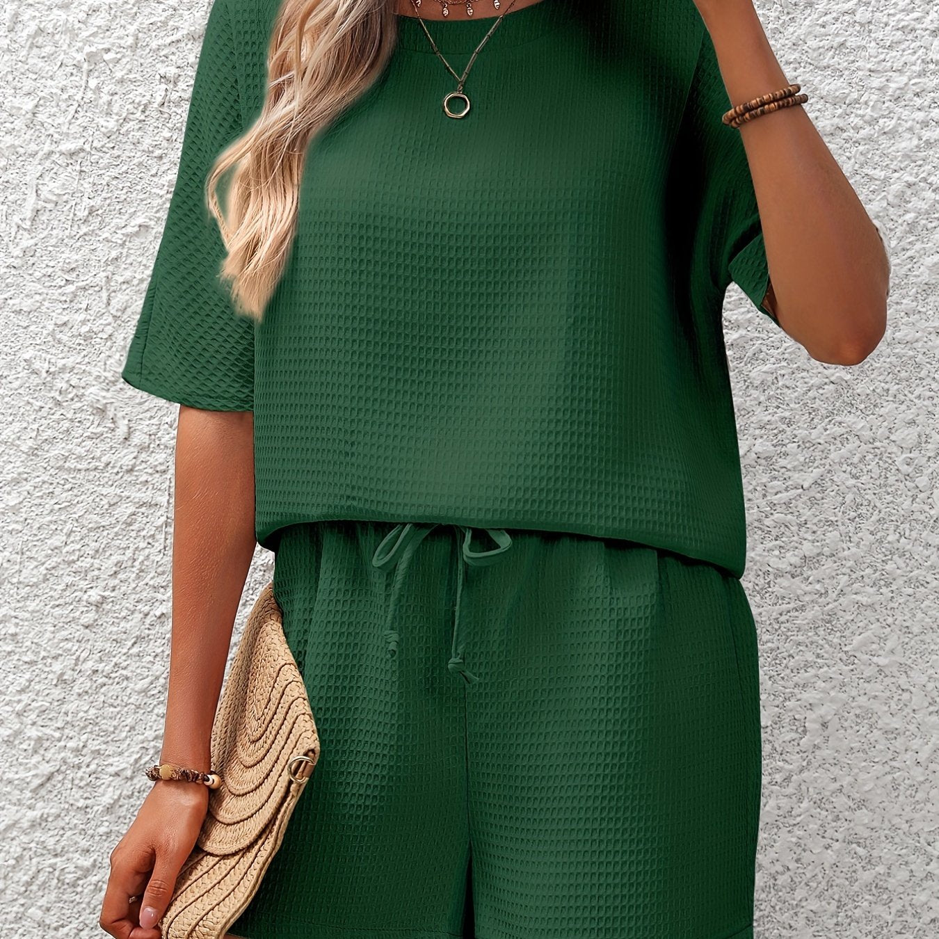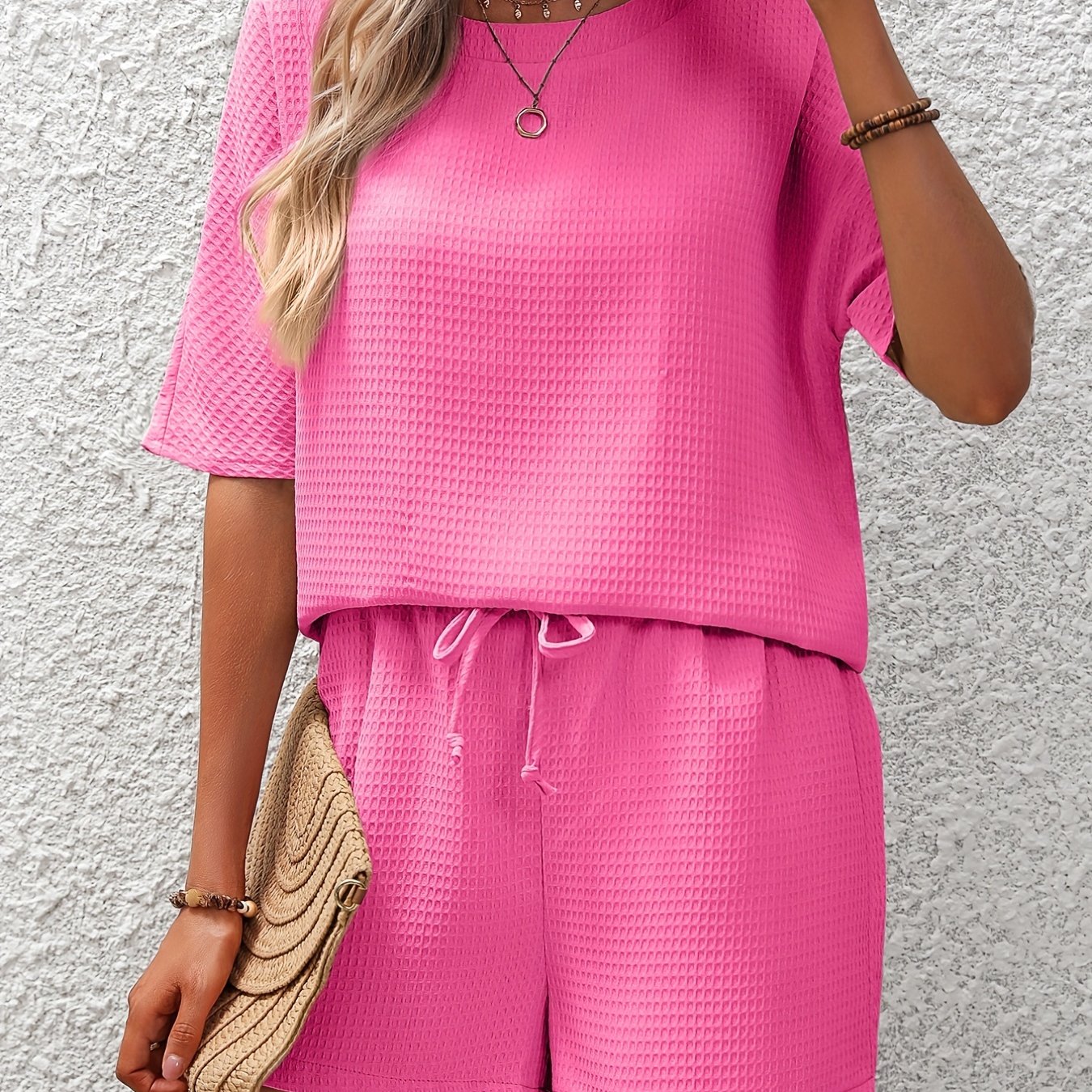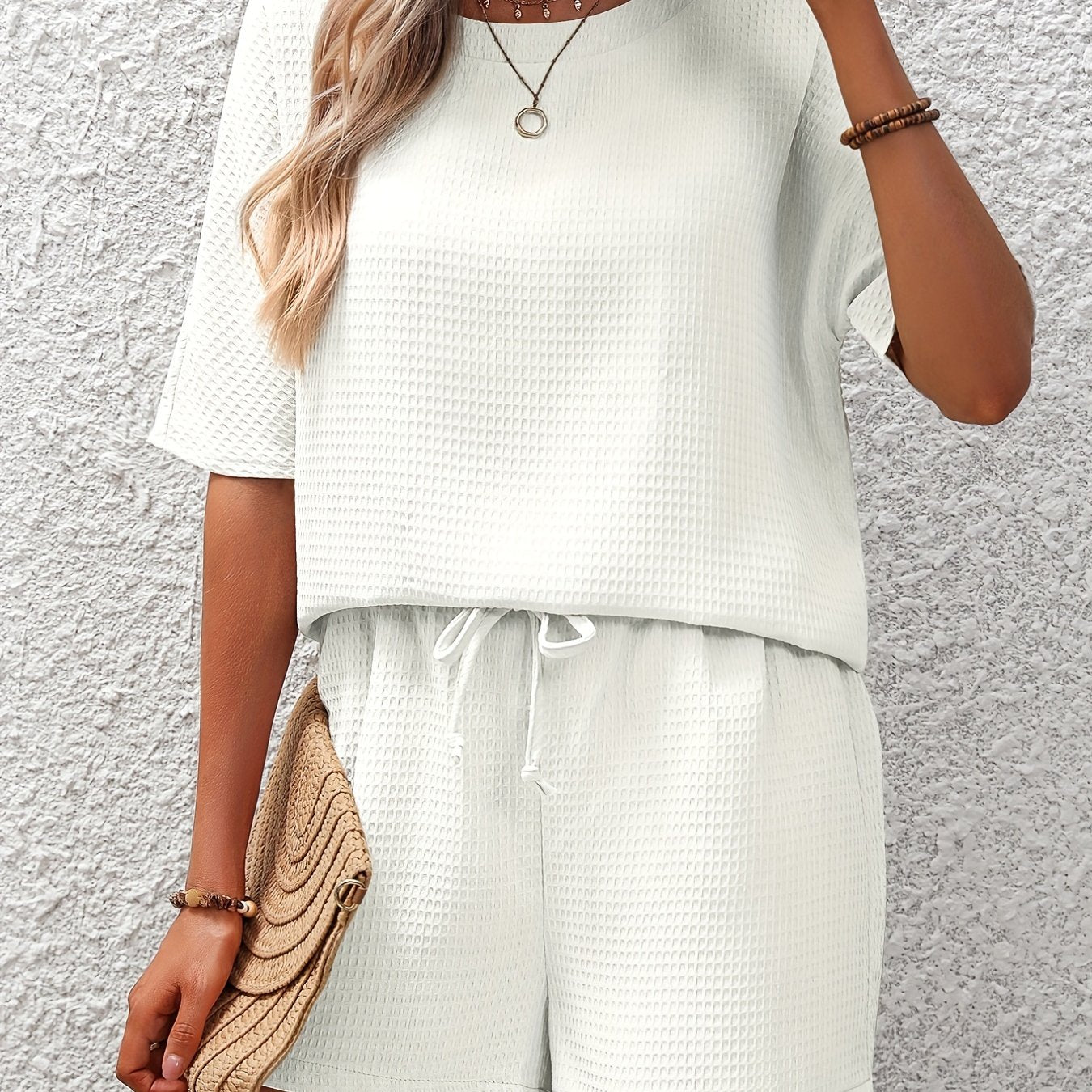 Solid Waffle Two-piece Set, Crew Neck Short Sleeve Tee & Drawstring Shorts Outfits, Women's Clothing