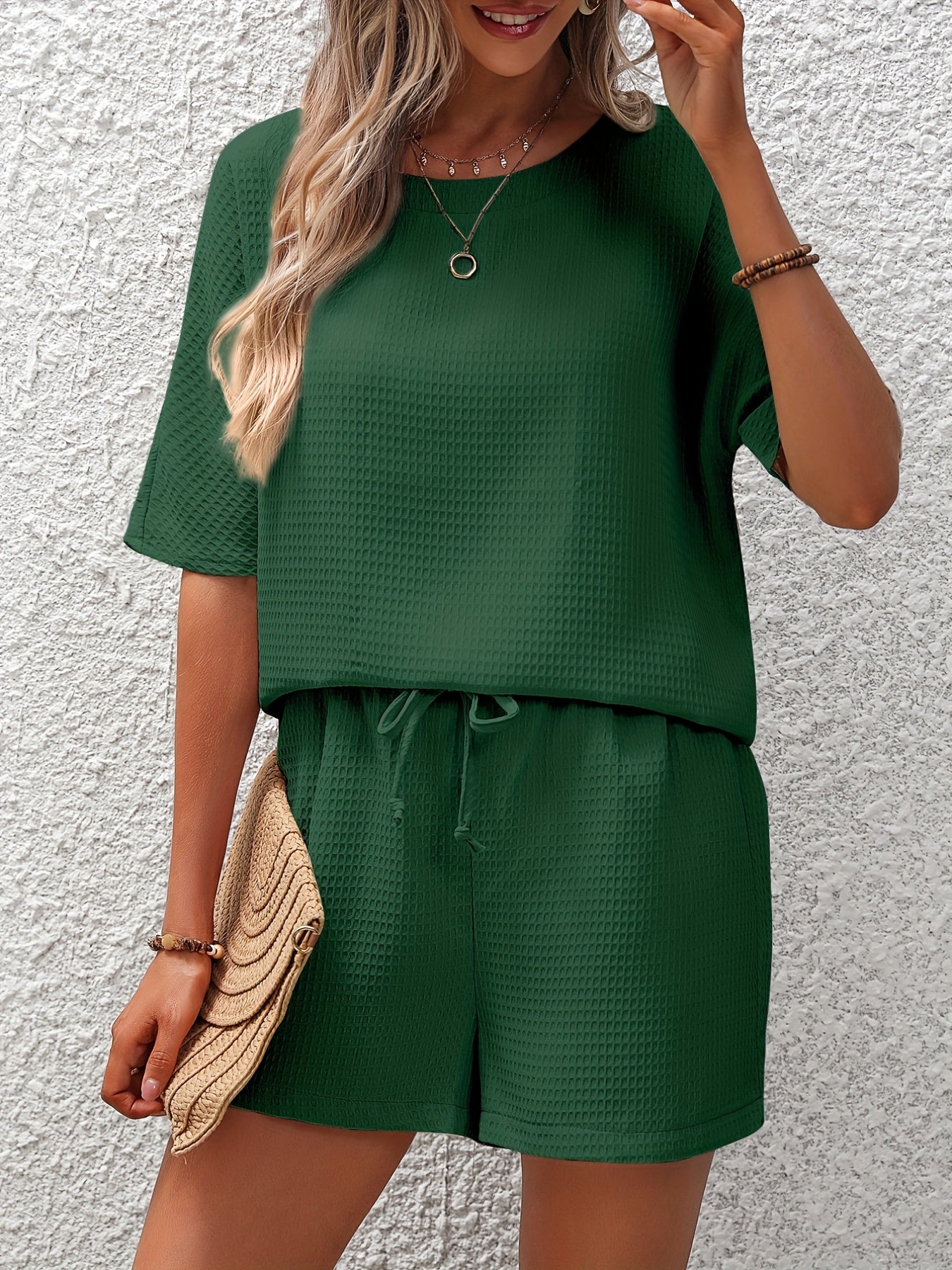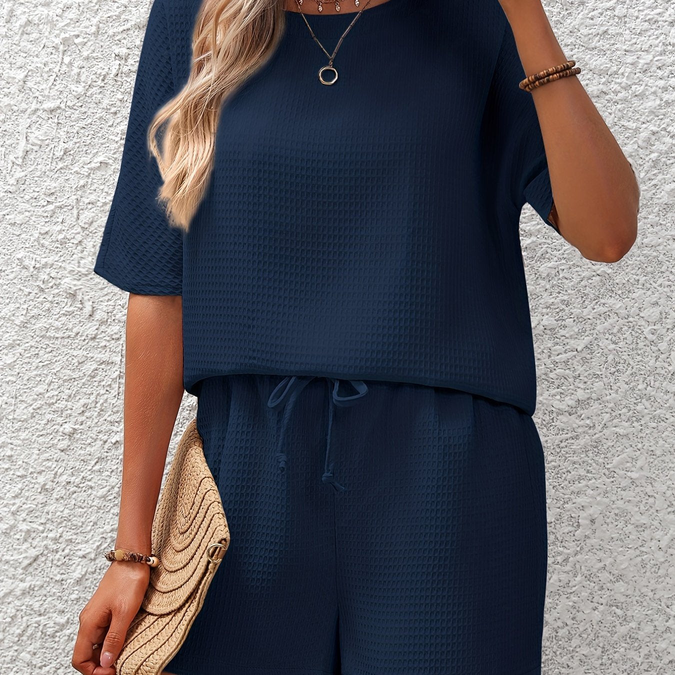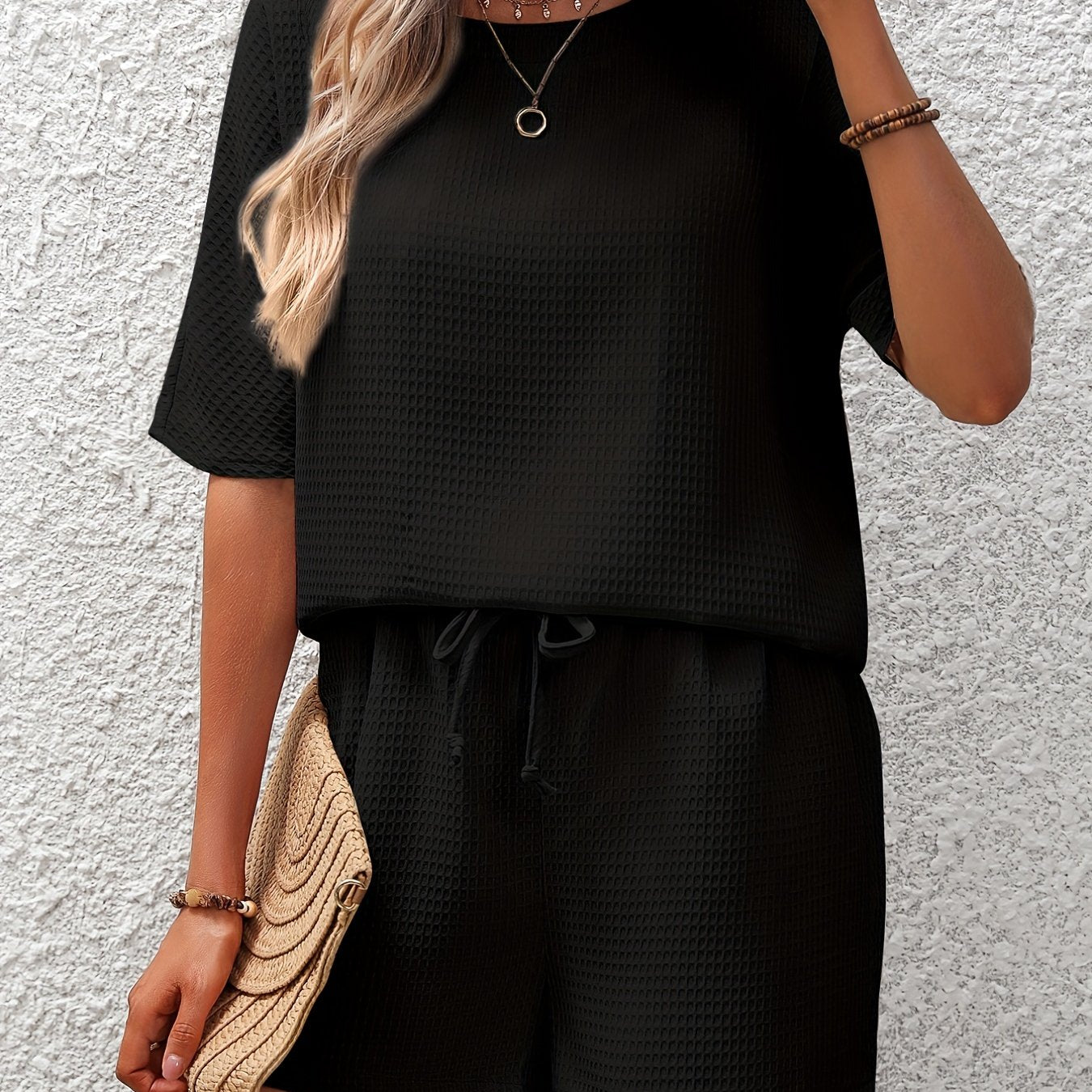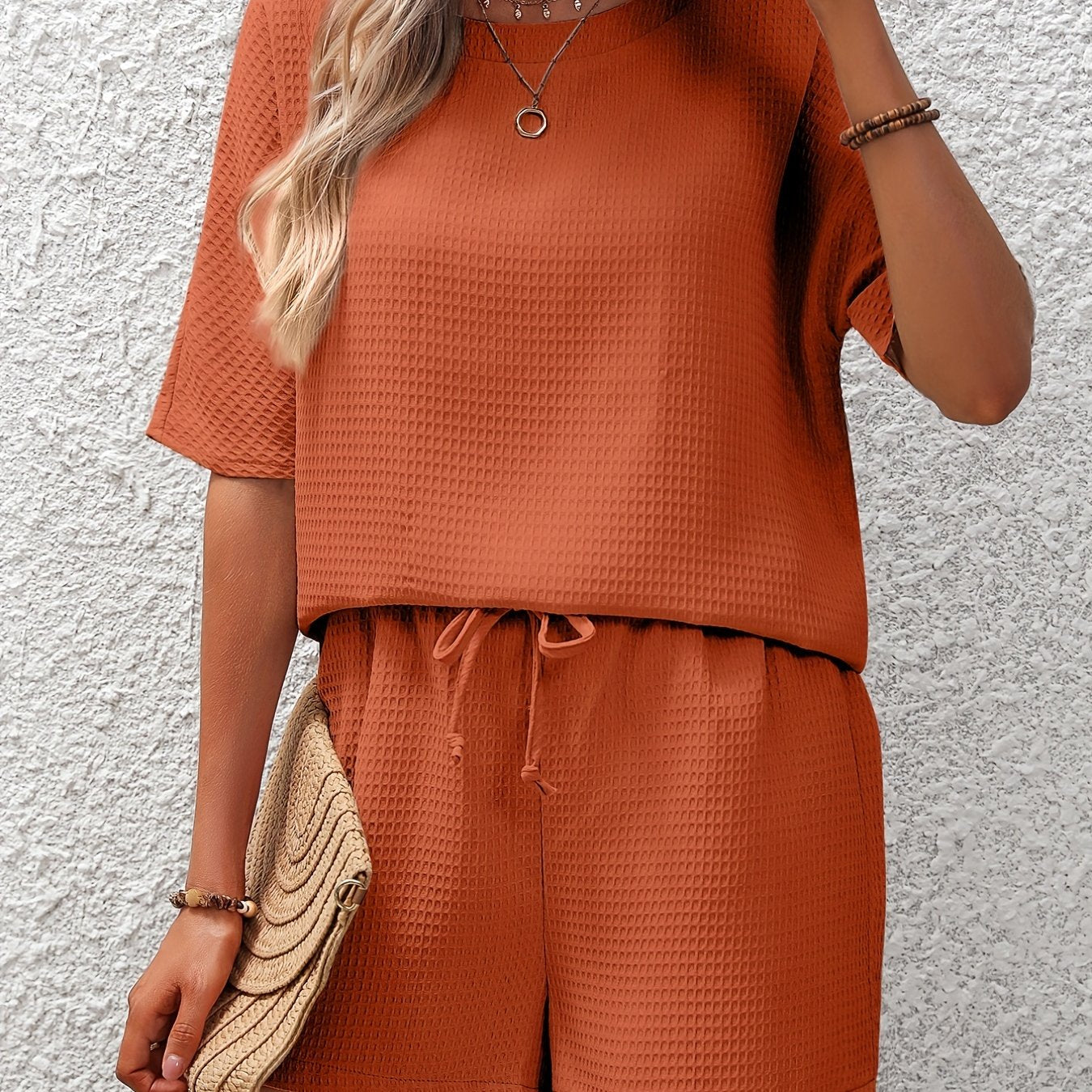 Solid Waffle Two-piece Set, Crew Neck Short Sleeve Tee & Drawstring Shorts Outfits, Women's Clothing